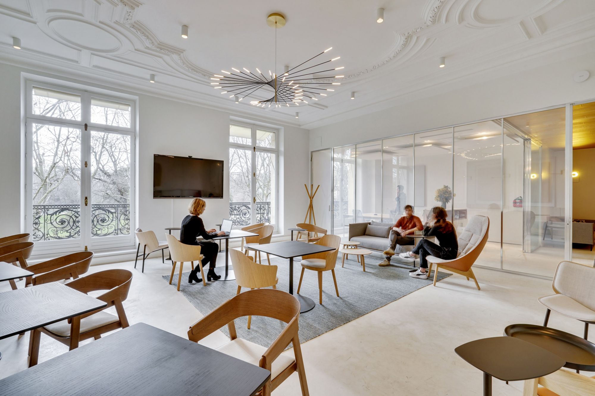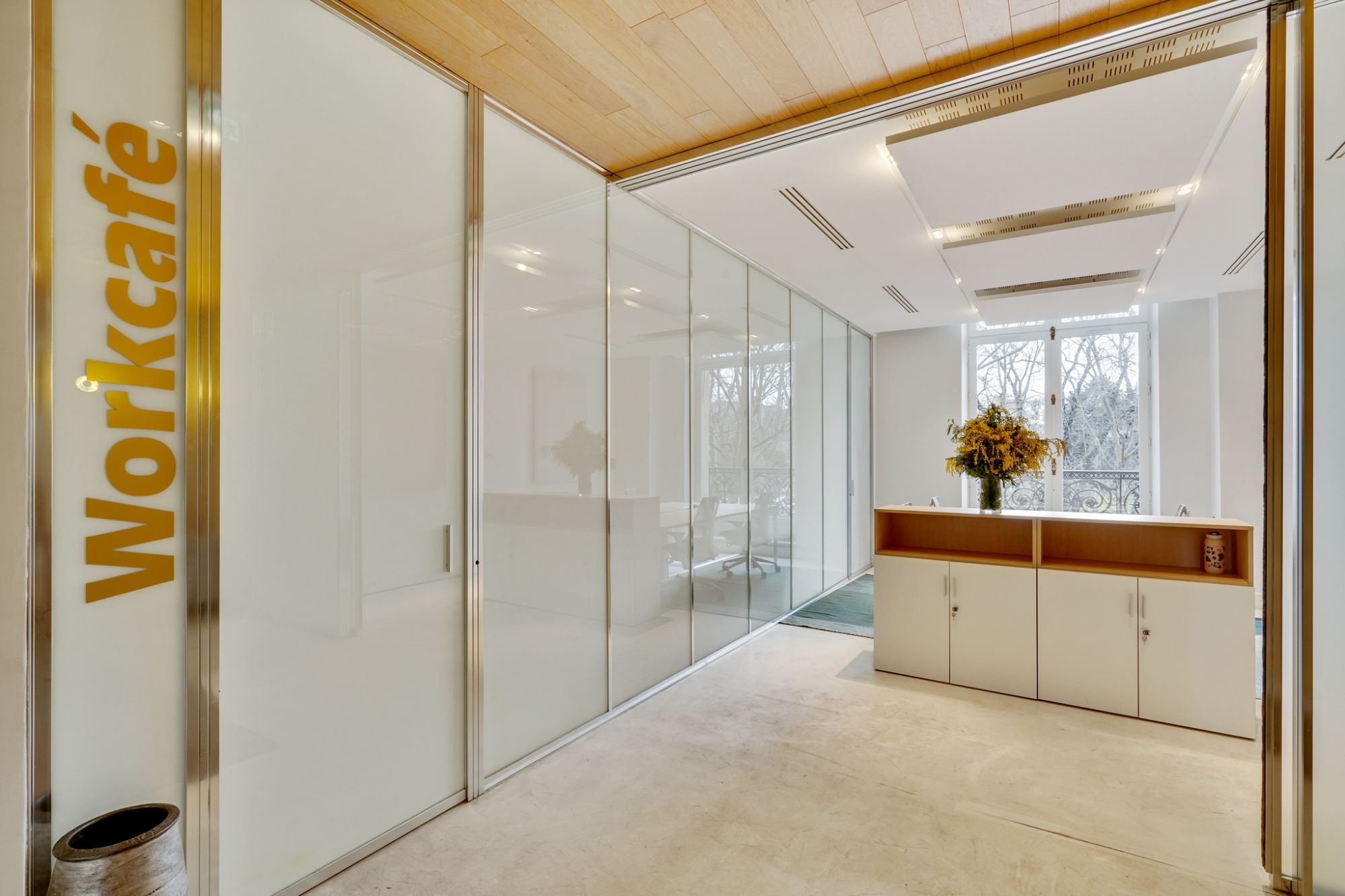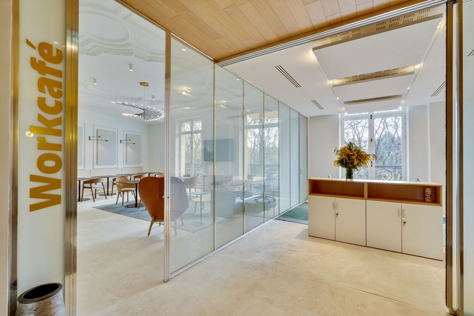 This is why some spaces are modular, in particular the Workcafé, a centerpiece that allows multiple uses, ranging from relaxation to events, including meetings, all of which is optimized by Priva-Lite glazing, glass with controlled occultation.